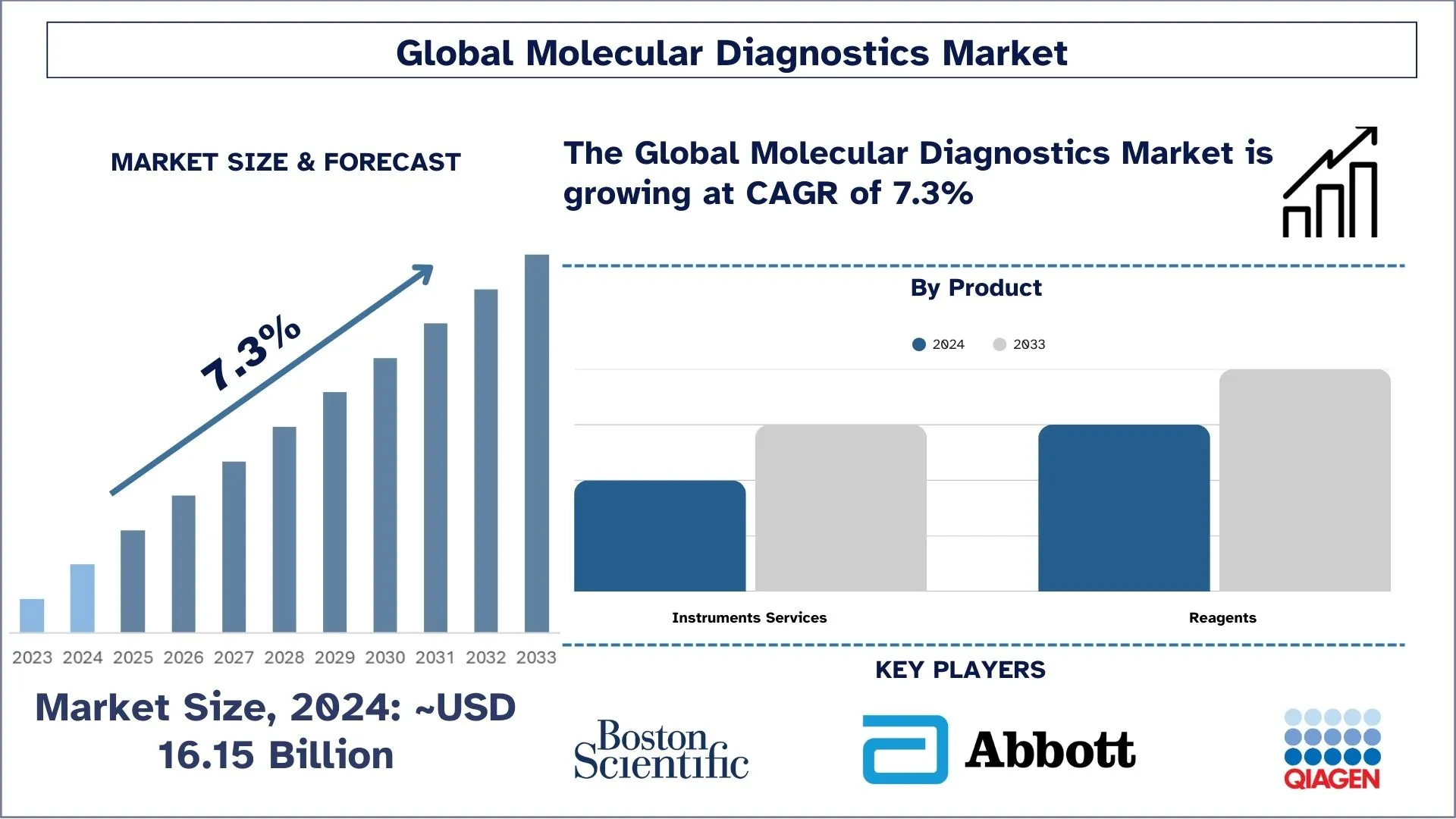 According to UnivDatos, the molecular diagnostics market was estimated at USD 16.15 billion in 2024 and is projected to expand at a compound annual growth rate (CAGR) of approximately 7.3% between 2025 and 2033. Market expansion is being fueled by the growing emphasis on early and precise disease identification, the rising adoption of personalized medicine, and the increasing integration of molecular testing within mainstream healthcare systems.
