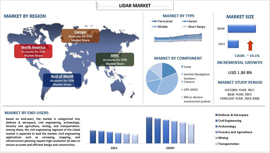 According to the UnivDatos “LiDAR Market” report, the global LiDAR market was valued at USD 1.84 billion in 2022 and is projected to expand at a CAGR of 14.1% from 2023 to 2030, reaching USD billion by 2030.