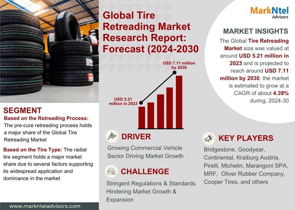As per recent study by MarkNtel Advisors The Global Tire Retreading Market size was valued at around USD 5.21 million in 2023 and is projected to reach around USD 7.11 million by 2030. Along with this, the market is estimated to grow at a CAGR of about 4.39% during the forecast period, i.e., 2024-30.
