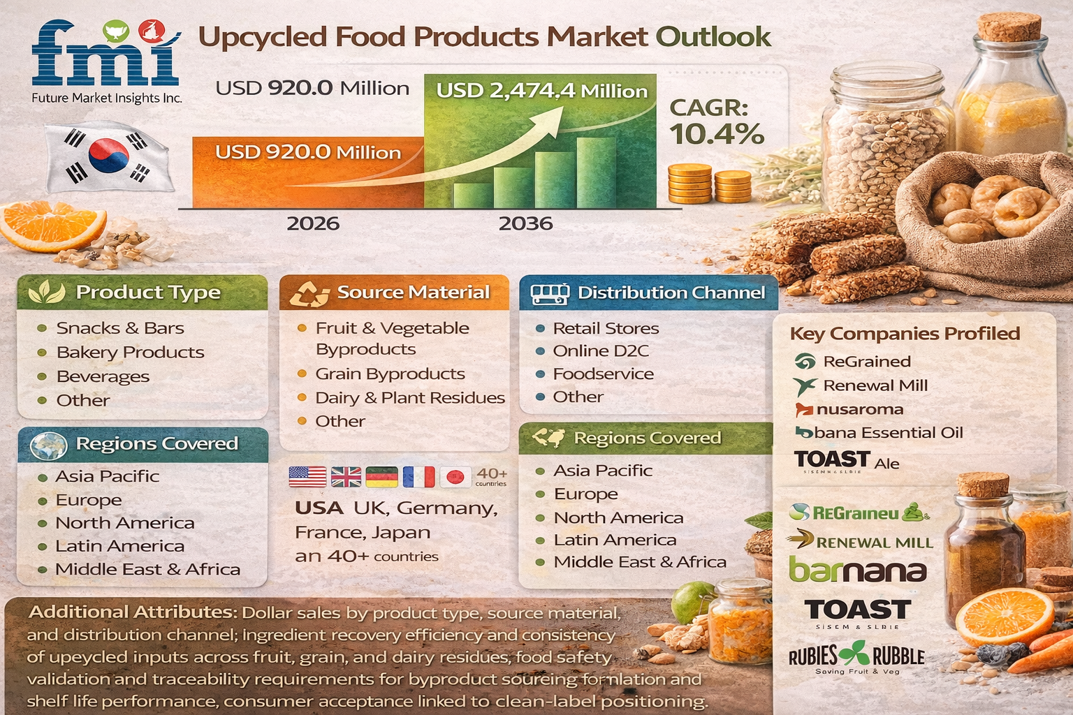 The global upcycled food products market is emerging as a high-growth segment within the sustainable food industry, driven by increasing awareness of food waste reduction, circular economy initiatives, and rising consumer demand for environmentally responsible products. The market is expected to be valued at approximately USD 920.0 million in 2026 and is projected to reach USD 2,474.4 million by 2036, expanding at a robust compound annual growth rate (CAGR) of 10.4% during the forecast period. This strong growth trajectory highlights the growing commercial viability of transforming food byproducts into value-added consumer products while addressing sustainability challenges across the global food system.