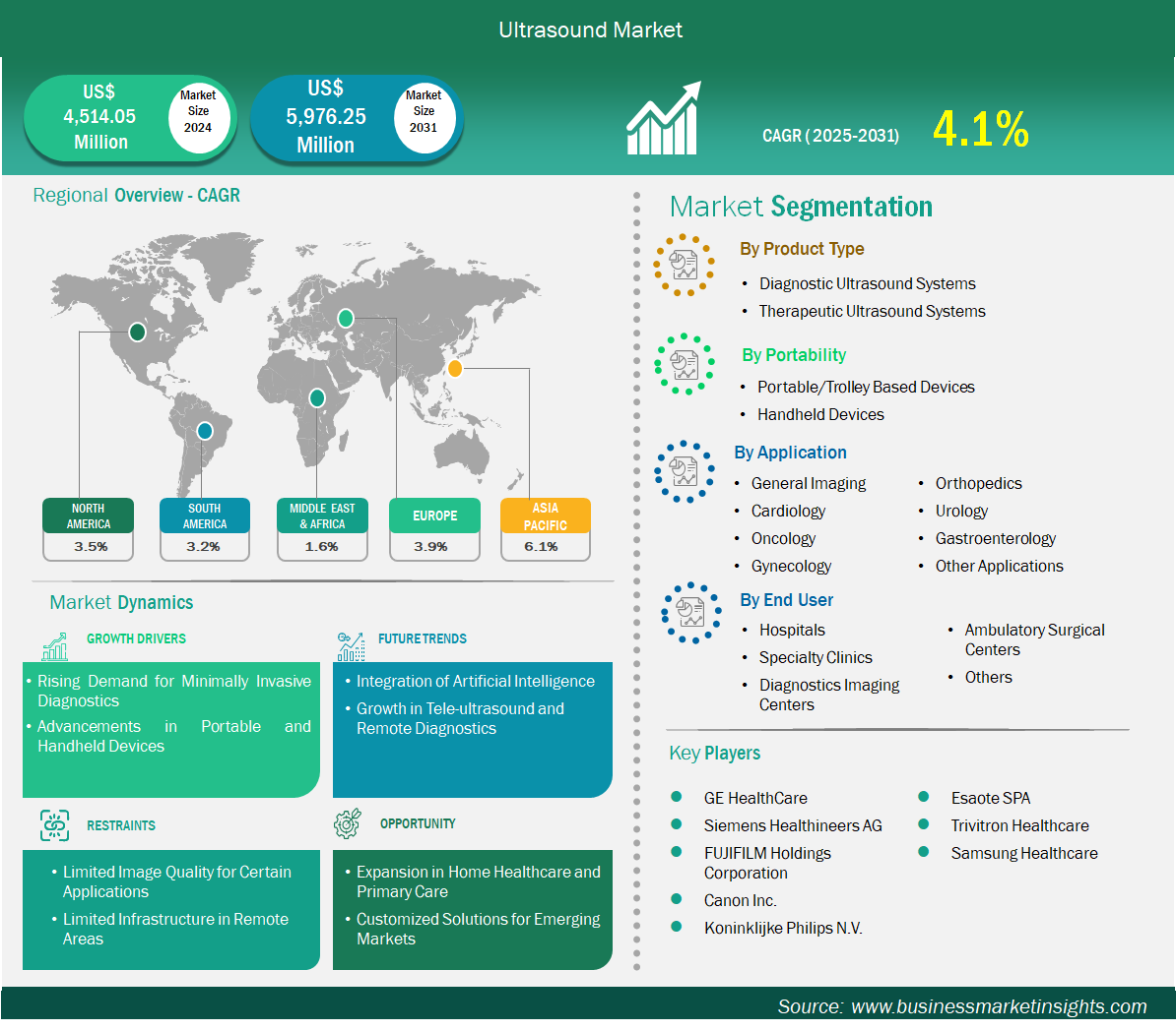 The ultrasound market size is expected to reach US$ 5,976.25 million by 2031, rising from US$ 4,514.05 million in 2024. The market is estimated to record a compound annual growth rate (CAGR) of 4.1% from 2025 to 2031, driven by rising diagnostic imaging demand, technological advancements, and increasing adoption of portable ultrasound devices.