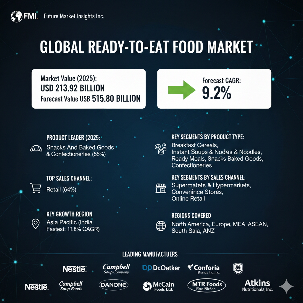 The global ready-to-eat (RTE) food market is undergoing a decisive transformation, moving from a convenience-driven niche into a core pillar of modern food consumption. Valued at USD 213.92 billion in 2025, the market is forecast to reach USD 515.80 billion by 2035, expanding at a robust compound annual growth rate (CAGR) of 9.2%. This rapid growth reflects structural shifts in how consumers shop, cook, and consume meals across both developed and emerging economies.