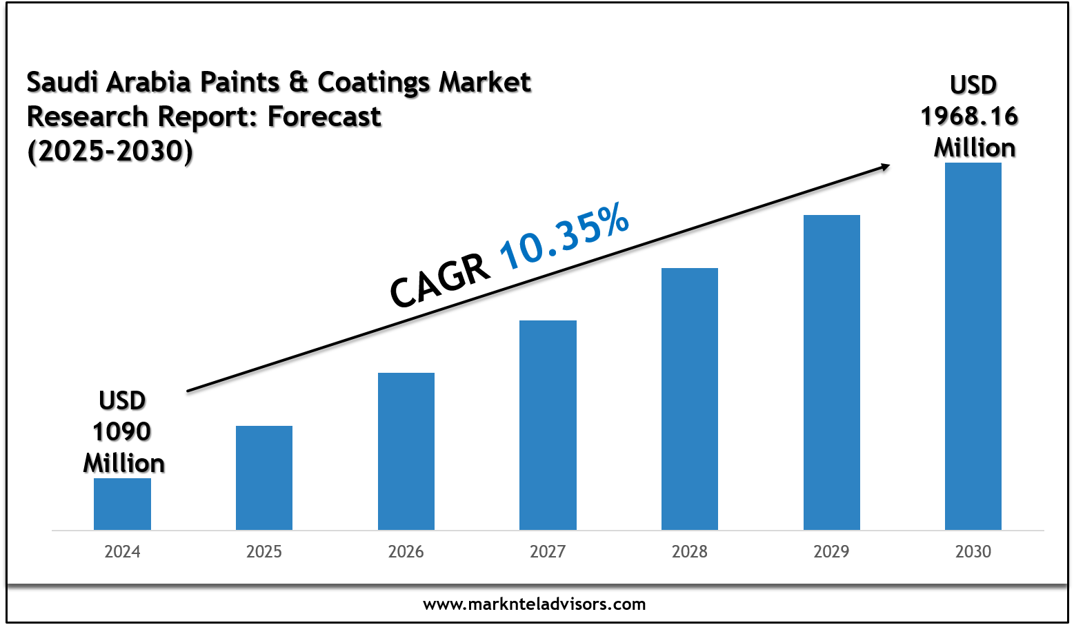 The Saudi Arabia Paints & Coatings Market size was valued at around USD 1090 million in 2024 and is expected to reach USD 1968.16 million by 2030. Along with this, the market is estimated to grow at a CAGR of around 10.35% during the forecast period, i.e., 2025-30.