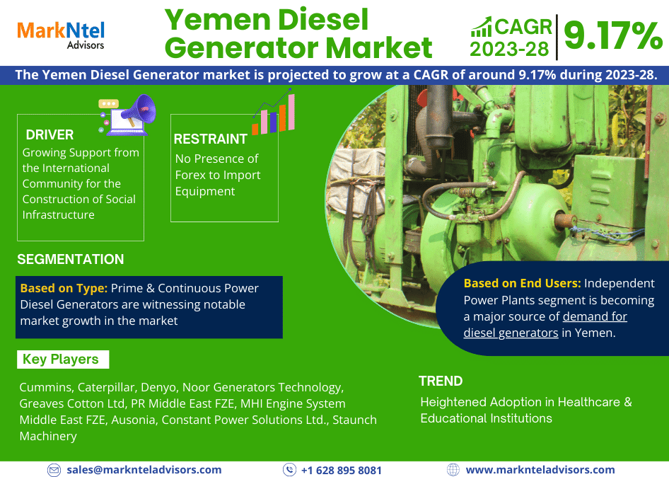 As per recent study by MarkNtel Advisors The Yemen Diesel Generator market is projected to grow at a CAGR of around 9.17% during the forecast period, i.e., 2023-28.