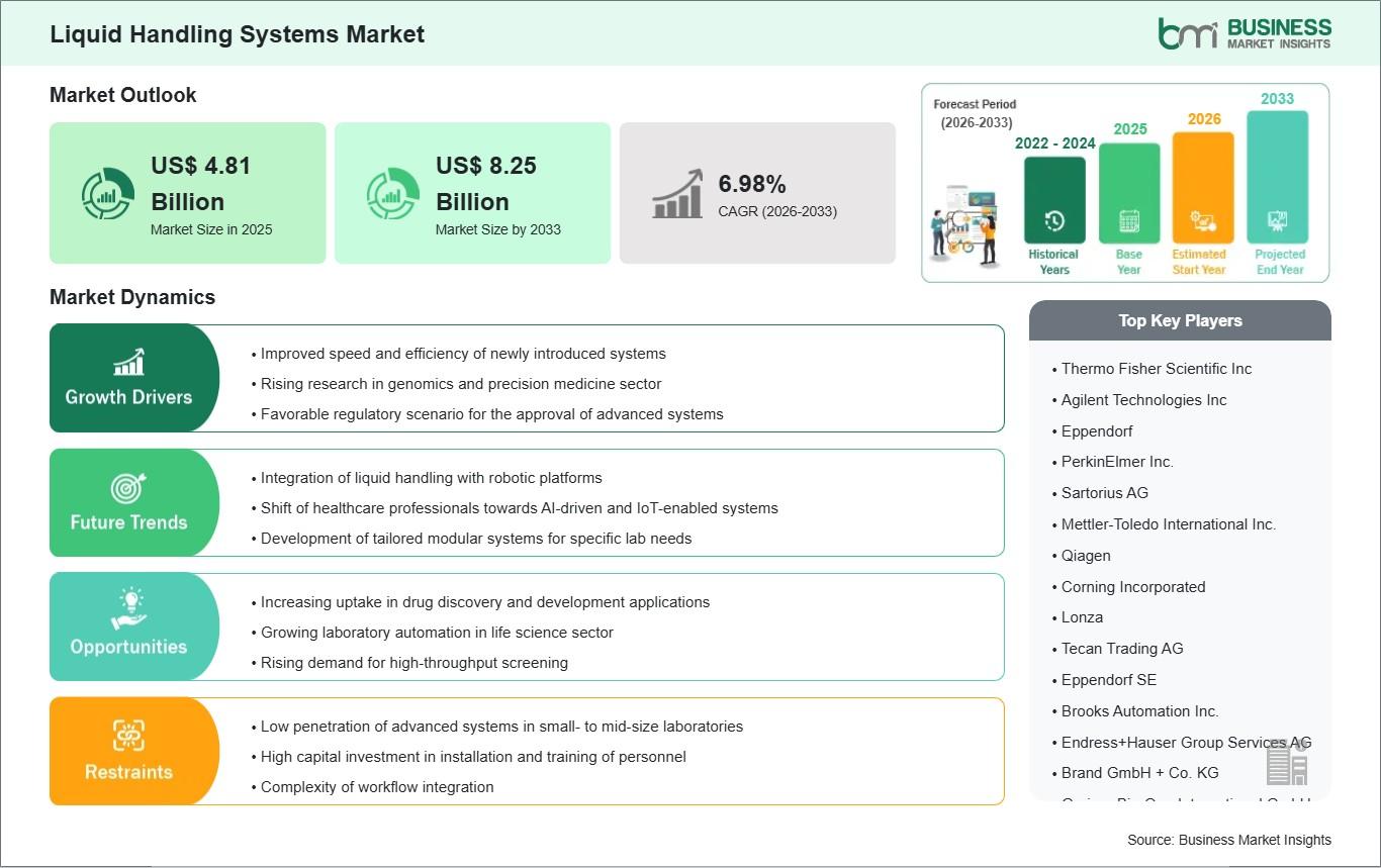 The Liquid Handling Systems Market is witnessing strong growth driven by the increasing demand for laboratory automation, rising research activities in life sciences, and growing adoption of precision technologies in drug discovery and diagnostics. The Liquid Handling Systems market size is expected to reach US$ 8.25 billion by 2033 from US$ 4.81 billion in 2025. The market is estimated to record a CAGR of 6.98% from 2026 to 2033, reflecting expanding use across biotechnology, pharmaceutical, and research laboratories worldwide.