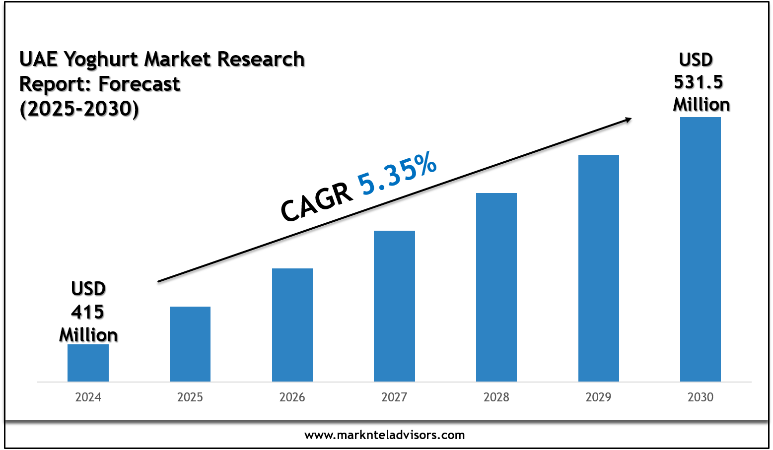 The Yoghurt market is anticipated to grow at a CAGR of around 5.35% during 2025-2030. The UAE Yoghurt Market size was valued at around USD 415 million in 2024 and is anticipated to exceed USD 531.5 million by 2030.