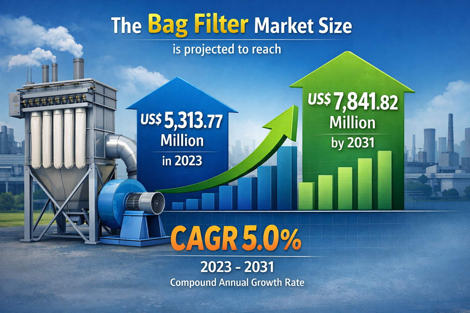 The Bag filter market is experiencing steady expansion as industries across the globe focus on improving air quality, controlling emissions, and ensuring compliance with environmental regulations. The market was valued at US$ 5,313.77 million in 2023 and is projected to reach US$ 7,841.82 million by 2031, registering a compound annual growth rate of 5.0% during the forecast period. Bag filters have become a crucial component in industrial air pollution control systems due to their ability to capture fine particulate matter with high efficiency. These filtration systems are widely used in industries such as chemical processing, pharmaceuticals, food and beverages, paper and pulp, and water treatment.