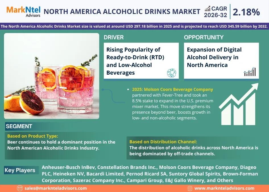 According to MarkNtel Advisors study The future of North America Alcoholic Drinks Market size is valued at around USD 297.18 billion in 2025 and is projected to reach USD 345.59 billion by 2032. Along with this, the market is estimated to grow at a CAGR of around 2.18% during the forecast period, i.e., 2026-32.