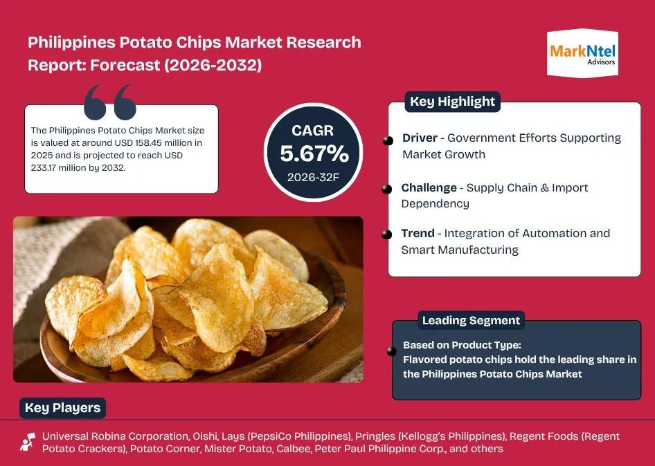 According to MarkNtel Advisors study The future of Philippines Potato Chips Market size is valued at around USD 158.45 million in 2025 and is projected to reach USD 233.17 million by 2032. Along with this, the market is estimated to grow at a CAGR of around 5.67% during the forecast period, i.e., 2026-32.