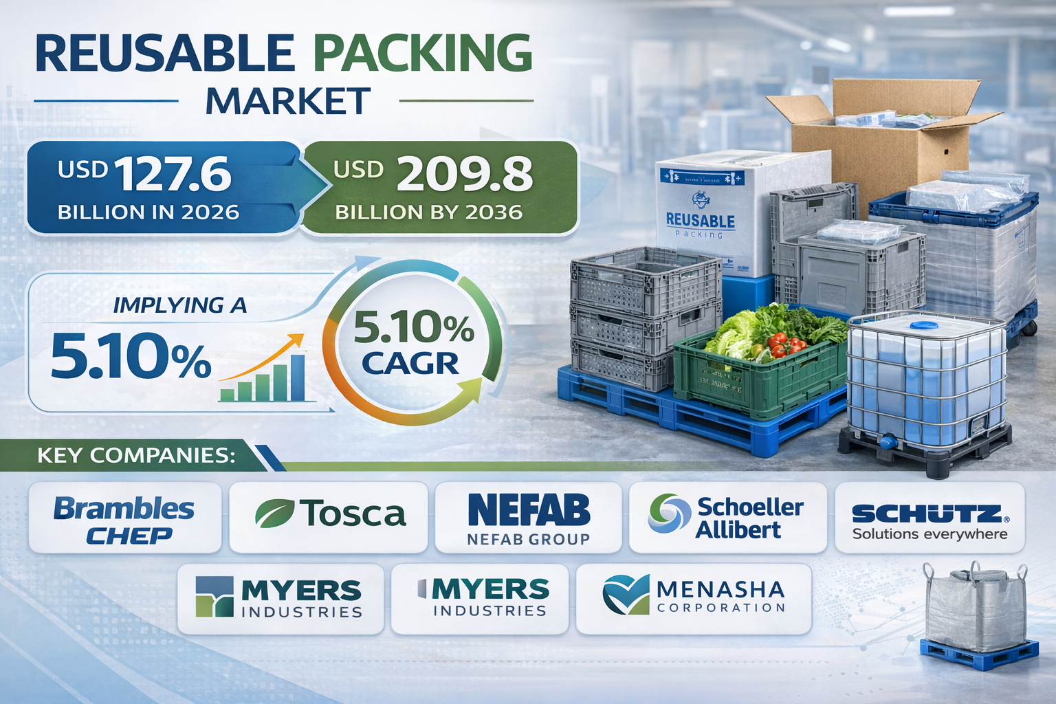 - Top companies Brambles (CHEP); Tosca Ltd.; Nefab Group; Schoeller Allibert; Schütz GmbH & Co. KGaA; Myers Industries; Menasha Corporation