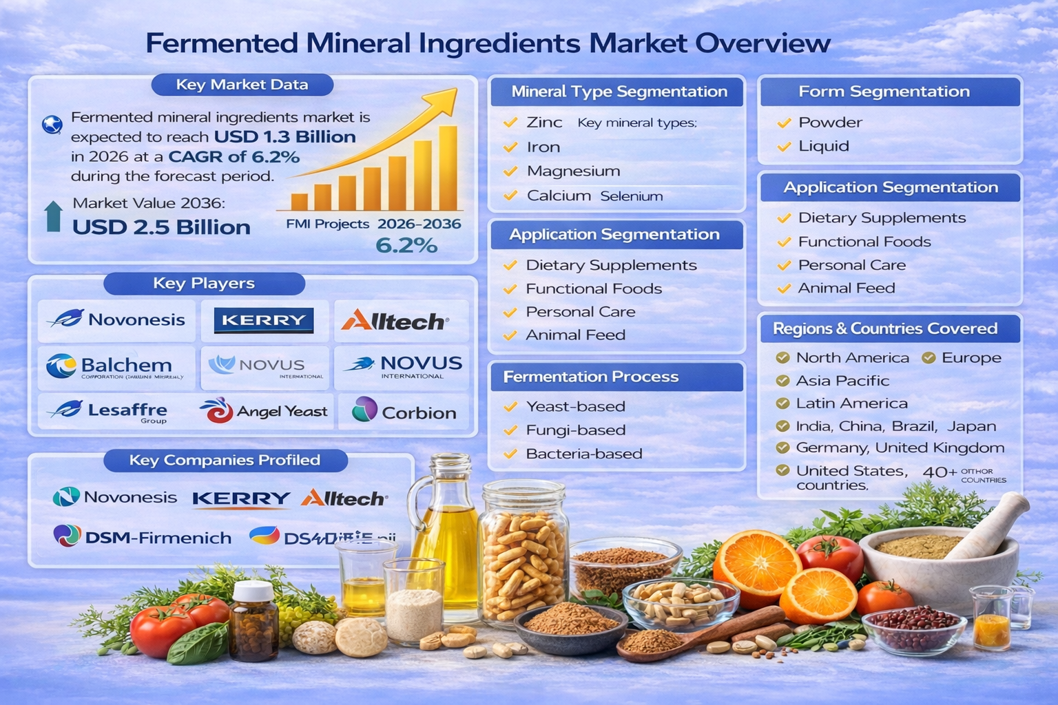 NEWARK, DELAWARE | March 16, 2026 — The global Fermented Mineral Ingredients Market is entering a decade of transformative growth, driven by a systemic shift in the nutraceutical and functional food sectors. Valued at USD 1.3 billion in 2026, the industry is projected to nearly double to USD 2.5 billion by 2036, expanding at a steady 6.3% CAGR, according to the latest strategic outlook from Future Market Insights (FMI).
