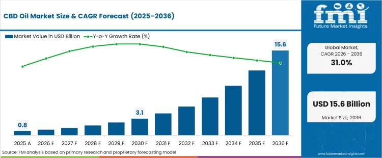 According to industry estimates, the CBD oil market value at USD 0.80 billion in 2025, and it is projected to reach USD 1.05 billion in 2026. Over the next decade, the sector is expected to witness remarkable growth, expanding to USD 15.60 billion by 2036, registering a compound annual growth rate (CAGR) of 31.0%. This rapid growth trajectory reflects the intersection of regulatory normalization, increased clinical research, and rising consumer demand for cannabinoid-based health products.