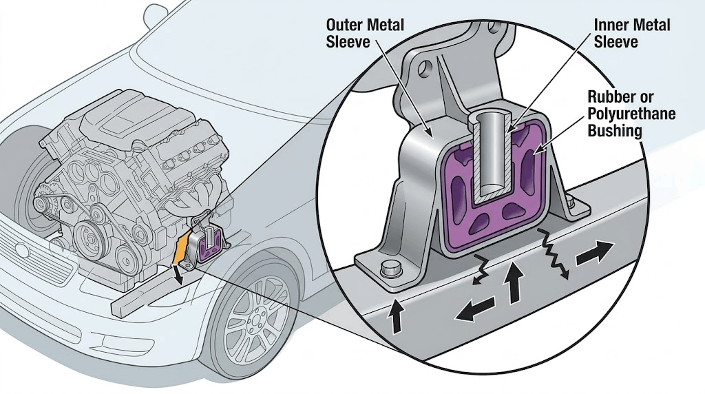 An engine bush is a vibration isolator providing a flexible interface between an engine or motor mounting point and the vehicle chassis, absorbing and dissipating vibration energy to prevent noise transmission to the occupant cabin and sensitive vehicle systems.