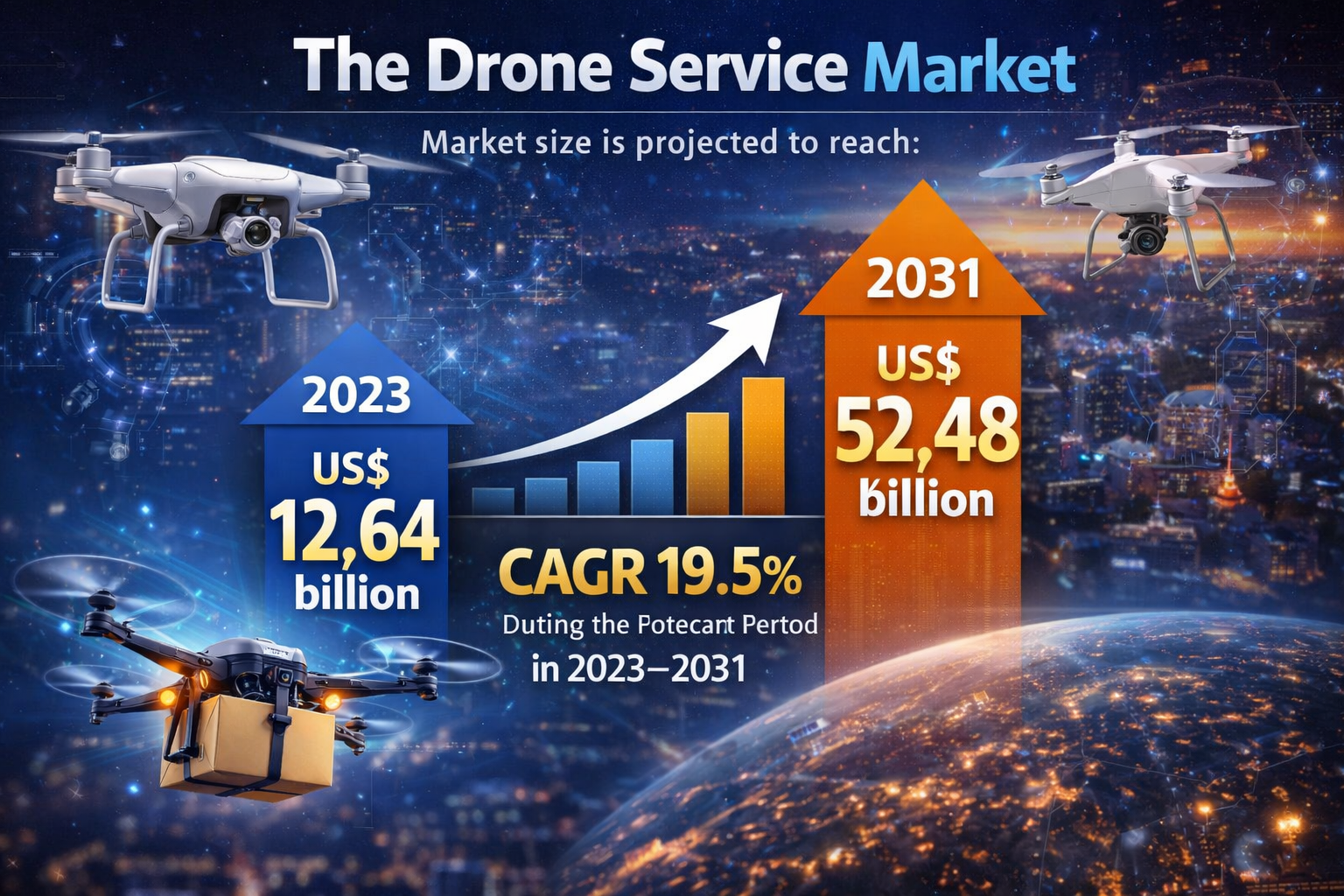 The global landscape of industrial operations is undergoing a radical transformation as unmanned aerial vehicles (UAVs) transition from novelty gadgets to essential enterprise tools. The Drone Service Market is becoming a cornerstone of modern infrastructure, offering efficiency and data accuracy that traditional methods cannot match. By outsourcing drone operations to specialized service providers, companies across various sectors can leverage high-end aerial technology without the heavy capital investment of maintaining internal fleets and specialized pilot teams.The Drone Service Market size is projected to reach US$ 52.48 billion by 2031 from US$ 12.64 billion in 2023. The market is expected to register a CAGR of 19.5% in 2023–2031.
