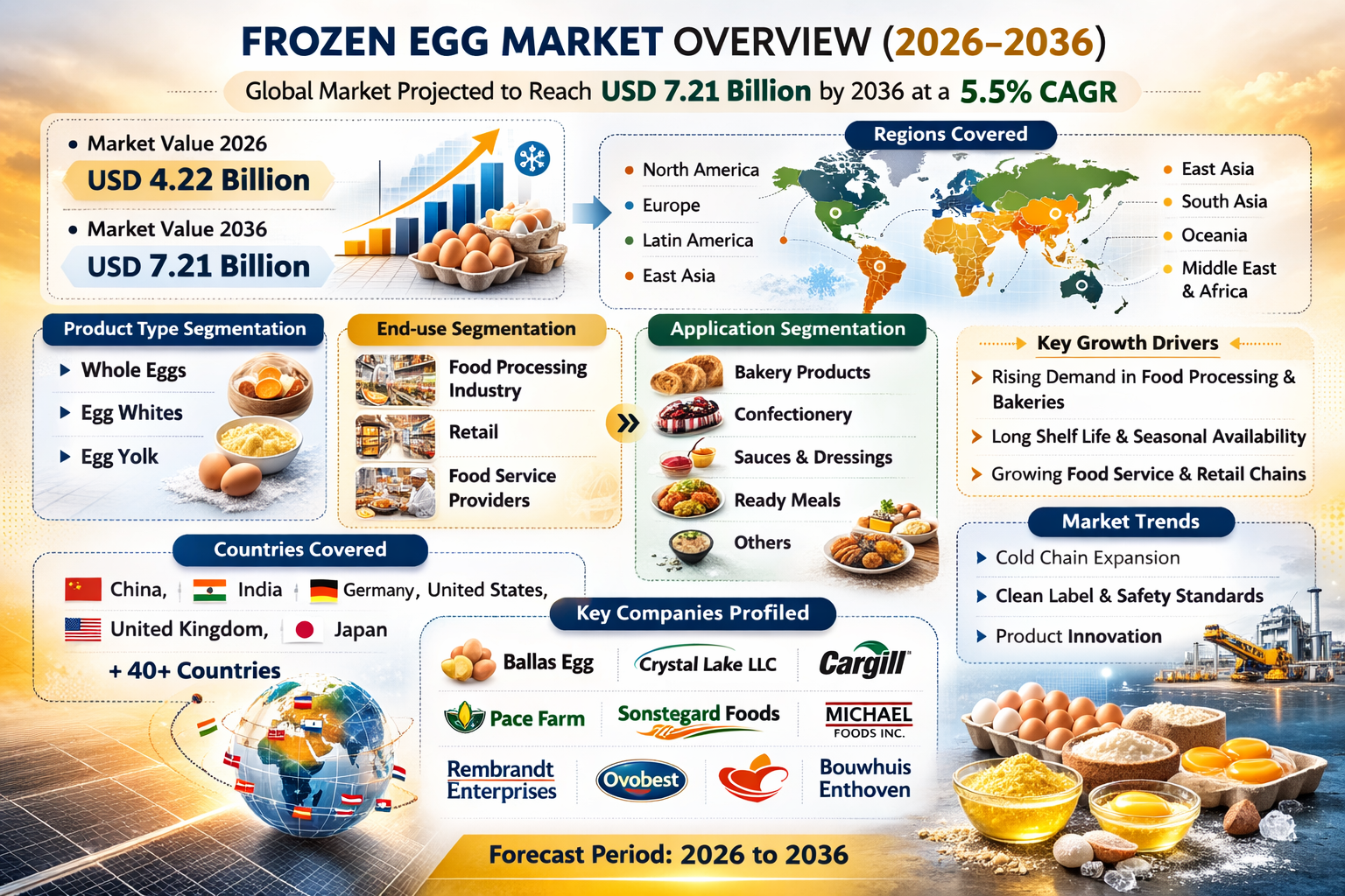 NEWARK, DELAWARE | March 18, 2026 — The global Frozen Egg Market is entering a transformative decade of growth, fueled by the industrialization of food processing and a global push for heightened food safety. Valued at USD 4.22 billion in 2026, the industry is projected to reach USD 7.21 billion by 2036, expanding at a steady 5.5% CAGR, according to the latest strategic intelligence from Future Market Insights (FMI).