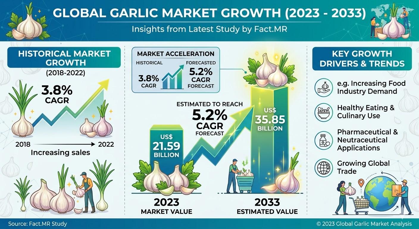 The global garlic market is entering a period of robust transformation, evolving from a kitchen staple into a high-value industrial and medicinal asset. According to the latest comprehensive analysis by Fact.MR, the market-valued at US$ 21.59 billion in 2023-is on a trajectory to reach US$ 35.85 billion by the end of 2033.