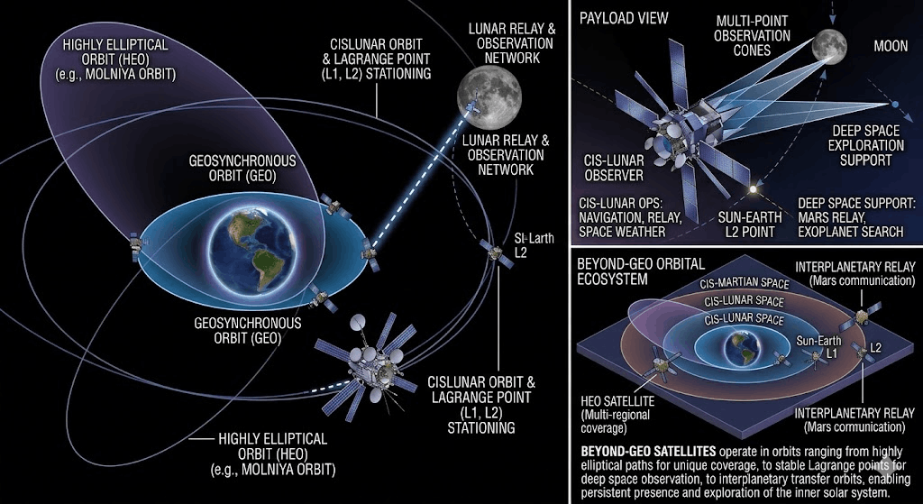 Cislunar relay satellite development for NASA and commercial lunar mission communication relay requirements, HEO polar connectivity system design for commercial and defense Arctic coverage applications, small satellite radiation-hardened platform development enabling cost-effective beyond GEO missions, advanced electric propulsion integration for efficient cislunar and HEO orbit achievement, and commercial lunar navigation service development for the emerging cislunar economy are the most active competitive strategy themes.