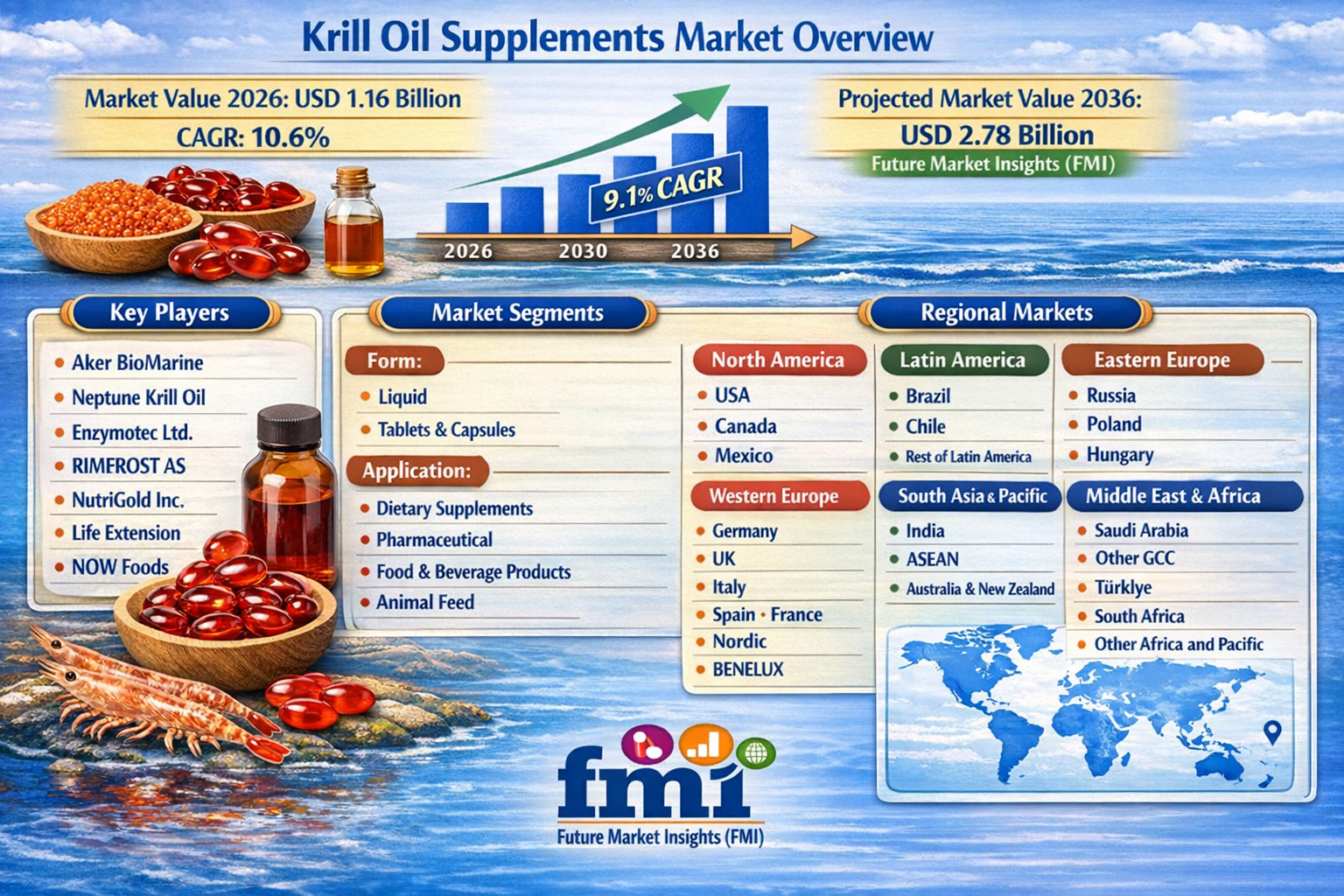 NEWARK, DELAWARE | March 24, 2026 — The global Krill Oil Supplements market is witnessing a significant transition, as clinical evidence of superior bioavailability reshapes consumer purchasing patterns. Valued at USD 405.4 million in 2025, the sector is projected to reach USD 1.16 billion in 2026. With a steady CAGR of 9.1%, the market is forecast to expand to USD 2.78 billion by 2036, according to Future Market Insights (FMI).
