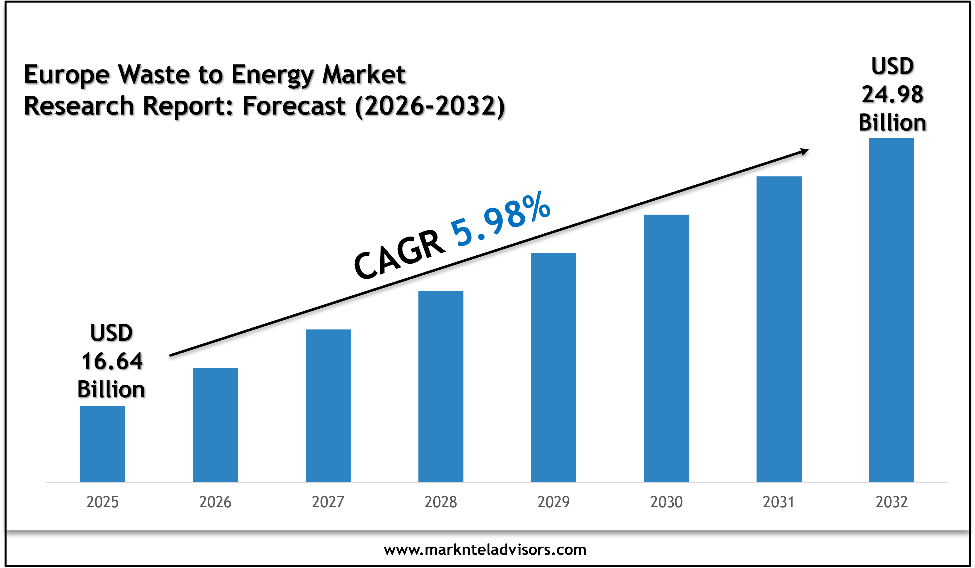 The Europe Waste to Energy Market size is valued at around USD 16.64 billion in 2025 and is projected to reach USD 24.98 billion by 2032. Along with this, the market is estimated to grow at a CAGR of around 5.98% during the forecast period, i.e., 2026-32.