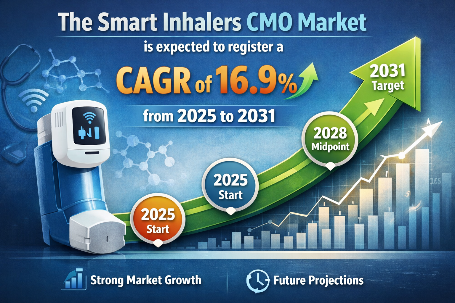 The Smart Inhalers CMO Market is witnessing a significant surge in demand as healthcare systems increasingly embrace digital health solutions to improve respiratory care outcomes. Smart inhalers, which integrate sensors and connectivity features, enable real-time monitoring of medication usage, adherence tracking, and patient behavior analysis. As respiratory diseases such as asthma and chronic obstructive pulmonary disease (COPD) continue to rise globally, the need for technologically advanced drug delivery systems has intensified. Contract Manufacturing Organizations (CMOs) play a vital role in this ecosystem by providing scalable, cost-effective, and compliant manufacturing solutions for smart inhaler devices. The Smart Inhalers CMO Market is expected to register a CAGR of 16.9% from 2025 to 2031, reflecting the strong growth potential driven by innovation and expanding healthcare needs.
