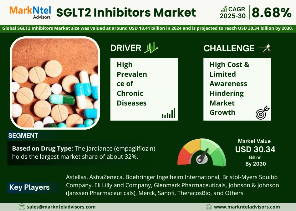According to MarkNtel Advisors study The future of SGLT2 Inhibitors Market size was valued at around USD 18.41 billion in 2024 and is projected to reach USD 30.34 billion by 2030. Along with this, the market is estimated to grow at a CAGR of around 8.68% during the forecast period, i.e., 2025-30.