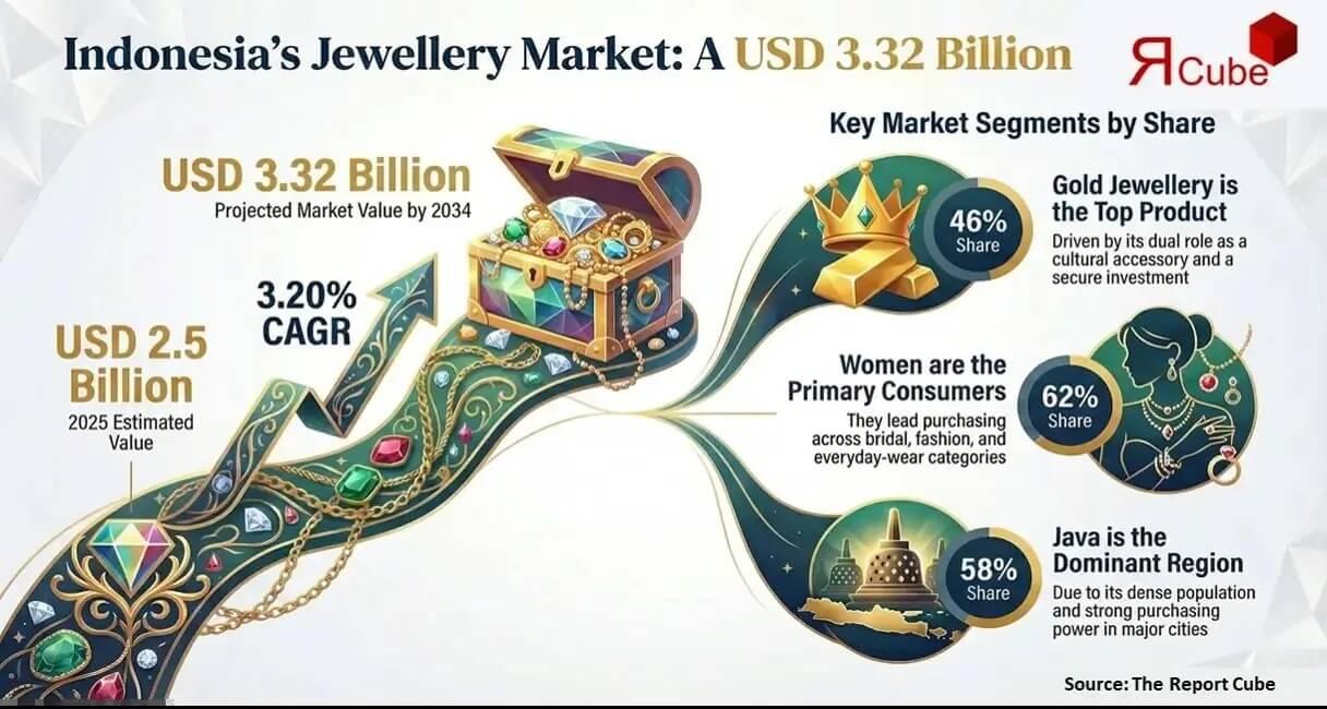 The Report Cube, a leading market research company, has officially released its latest study titled "Indonesia Jewelry Market Report and Forecast 2026-2034" The report projects the size of Indonesia Jewelry market to be valued at USD 3.32 Billion by the end of the forecast period, expanding at a compound annual growth rate (CAGR) of 3.20%.