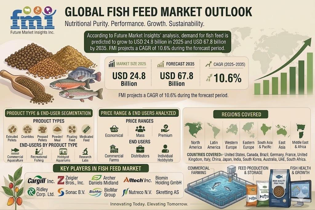 NEWARK, Del., USA | April 8, 2026 — According to the latest market analysis by Future Market Insights, the global fish feed market is poised for robust growth, driven by rising demand for sustainable aquaculture, increasing seafood consumption, and rapid advancements in feed technology. The market is projected to grow from USD 24.8 billion in 2025 to USD 67.8 billion by 2035, registering a CAGR of 10.6% during the forecast period.