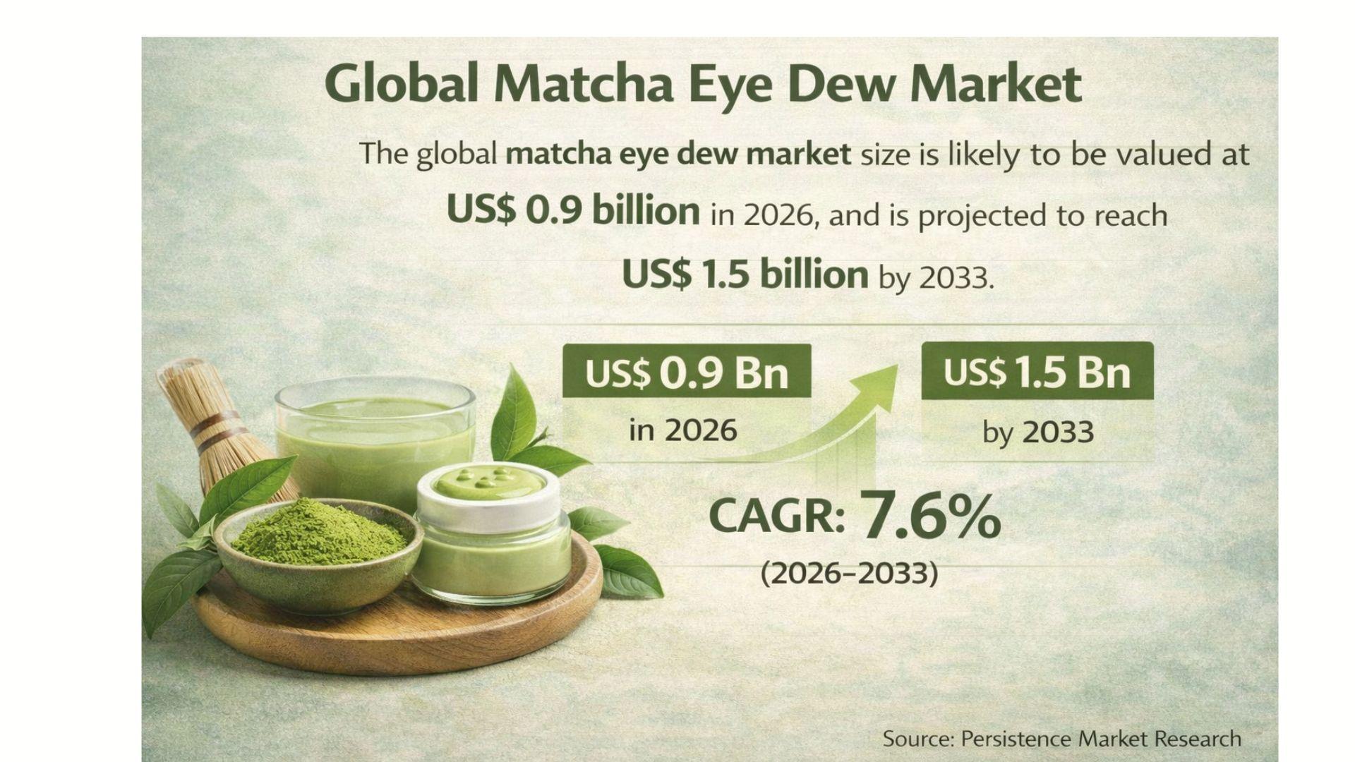 The global matcha eye dew market is emerging as a niche yet rapidly expanding segment within the broader skincare and personal care industry. With increasing consumer awareness regarding natural and plant-based skincare solutions, matcha-infused products are gaining traction due to their antioxidant-rich properties and skin-rejuvenating benefits. The market is expected to be valued at US$0.9 billion in 2026 and is projected to reach US$1.5 billion by 2033, growing at a CAGR of 7.6% during the forecast period. Matcha eye dew, known for its soothing, anti-inflammatory, and anti-aging properties, is becoming a preferred solution for addressing under-eye concerns such as puffiness, dark circles, and fine lines. The growing demand for clean-label beauty products, combined with rising consumer preference for organic and chemical-free formulations, is significantly contributing to market growth.