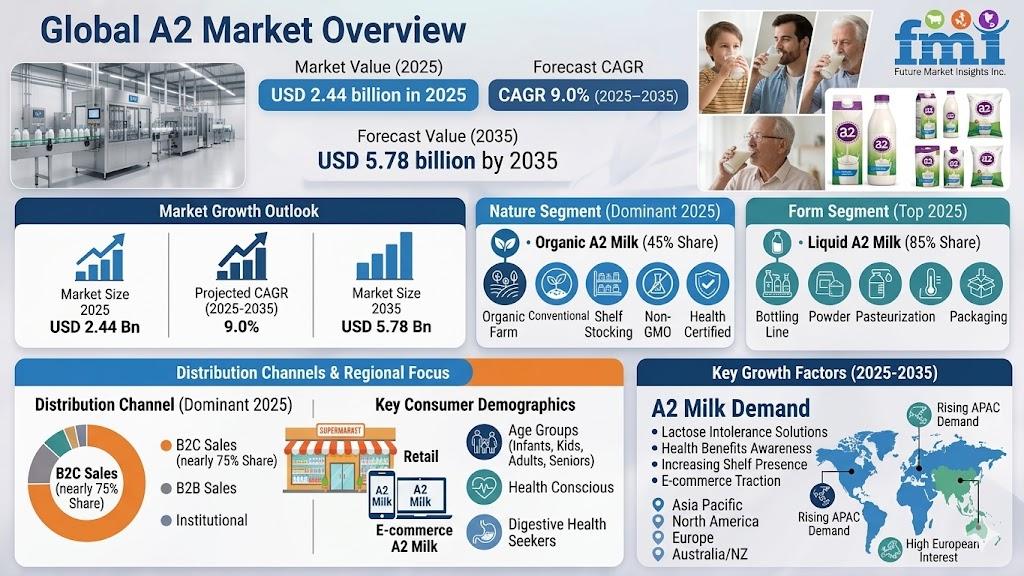 The global A2 milk market is poised for robust expansion, projected to grow from USD 2.44 billion in 2025 to USD 5.78 billion by 2035, registering a strong CAGR of 9.0% during the forecast period. Growth is fueled by rising awareness of digestive health, increasing demand for lactose-friendly dairy alternatives, and expanding availability of A2-based products across global retail channels.