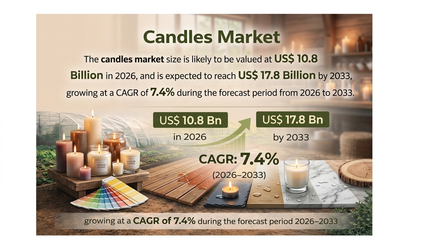 The global candles market is experiencing strong and consistent growth, driven by rising demand for home décor products, wellness-oriented lifestyle trends, and increasing adoption of aromatherapy and scented candles. The market is projected to be valued at US$10.8 billion in 2026 and is expected to reach US$17.8 billion by 2033, growing at a CAGR of 7.4% during the forecast period. Candles are no longer limited to lighting purposes; they have evolved into premium lifestyle products used for relaxation, ambiance creation, meditation, and gifting. The increasing popularity of home fragrance products, especially in urban households, is significantly contributing to market expansion. Additionally, social media influence and the rise of aesthetic home décor trends are further fueling consumer demand for decorative and scented candles.