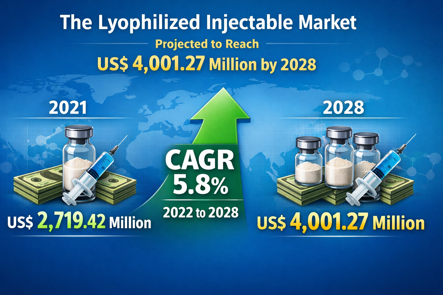 The global lyophilized injectable market has been witnessing steady growth due to increasing demand for stable and effective drug delivery systems. Lyophilized injectables, also known as freeze-dried injectables, are widely used in the pharmaceutical industry due to their extended shelf life, improved stability, and enhanced bioavailability. These products are particularly beneficial for treating chronic diseases, infectious conditions, and oncology-related disorders. The lyophilized injectable market is projected to reach US$ 4,001.27 million by 2028 from US$ 2,719.42 million in 2021; it is expected to grow at a CAGR of 5.8% from 2022 to 2028. The growing adoption of biologics and advancements in pharmaceutical manufacturing technologies are further accelerating market expansion.