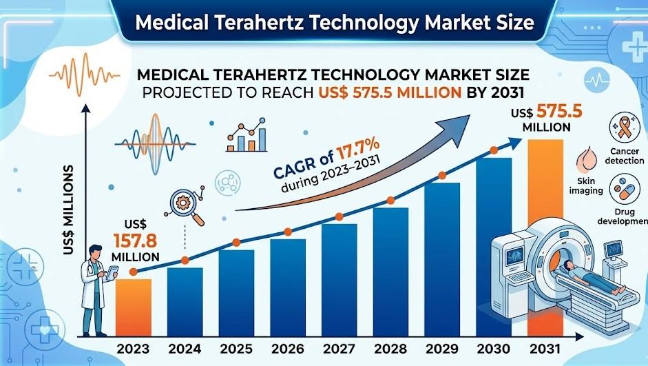 The Medical Terahertz Technology Market Scope is strongly supported by significant growth projections. The market size is projected to reach US$ 575.5 million by 2031 from US$ 157.8 million in 2023, reflecting a robust CAGR of 17.7% during 2023–2031. This rapid expansion highlights increasing adoption across clinical and research environments.