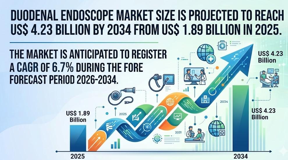 The global duodenal endoscope industry is witnessing steady expansion, supported by the increasing burden of gastrointestinal disorders and the rising need for precise diagnostic and therapeutic procedures. The industry is projected to grow from US$ 1.89 billion in 2025 to US$ 4.23 billion by 2034, registering a CAGR of 6.7% during the forecast period. Healthcare systems across developed and developing regions are focusing on improving early detection and treatment outcomes, which is significantly boosting the adoption of advanced endoscopic technologies.
