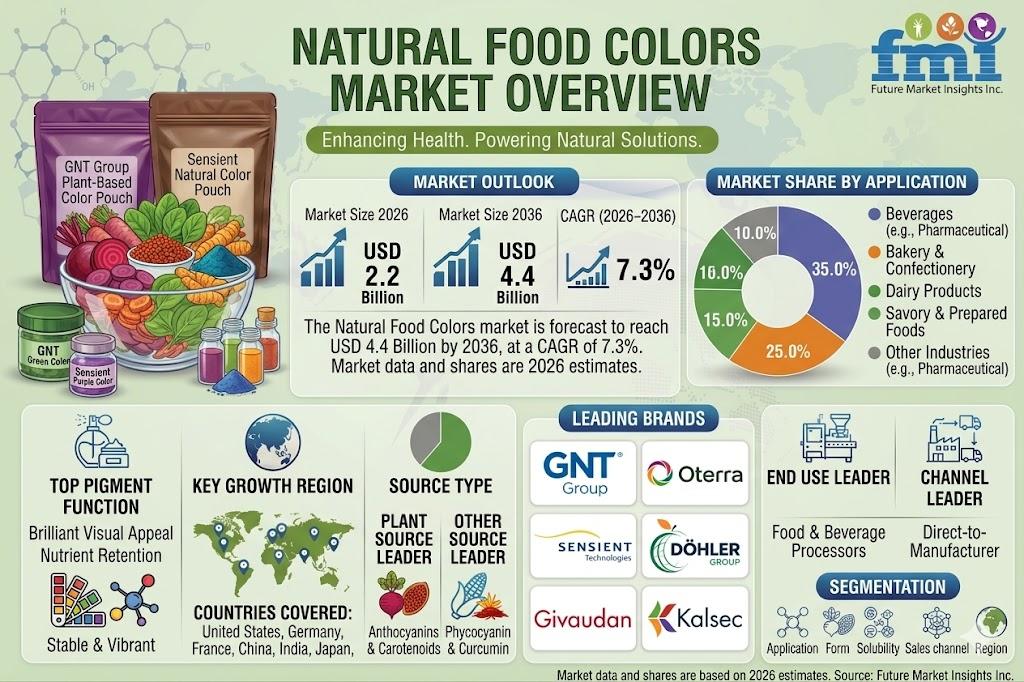 NEWARK, Del., USA | April 21, 2026 — According to the latest analysis by Future Market Insights (FMI), the global natural food colors market is poised for robust expansion as food and beverage manufacturers accelerate the shift away from synthetic dyes. The market, valued at USD 2.0 billion in 2025, is estimated to reach USD 2.2 billion in 2026 and is projected to grow to USD 4.4 billion by 2036, registering a CAGR of 7.3% during the forecast period.