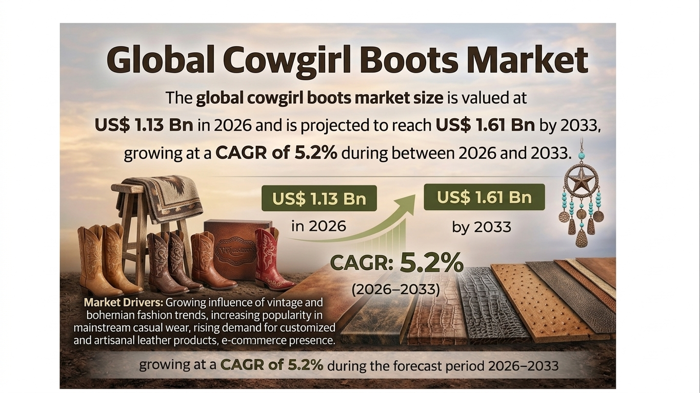 The global cowgirl boots market is witnessing steady expansion, driven by evolving fashion preferences, increasing demand for Western-inspired footwear, and rising consumer inclination toward premium leather products. The global Cowgirl Boots market size is valued at US$ 1.13 Bn in 2026 and is projected to reach US$ 1.61 Bn by 2033, growing at a CAGR of 5.2% between 2026 and 2033. Cowgirl boots, once rooted in traditional Western culture, have transformed into a mainstream fashion statement across urban and semi-urban markets. Their appeal lies in their durability, distinctive aesthetics, and versatility, making them suitable for both functional and fashion-oriented use. The growing influence of Western fashion trends through social media platforms and celebrity endorsements has significantly amplified consumer interest, particularly among younger demographics.