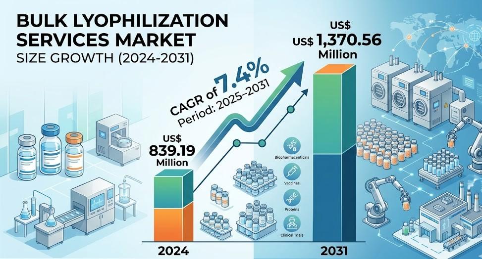 The Bulk Lyophilization Services Market Analysis reflects a strong upward trajectory, with the Bulk lyophilization Services Market valued at US$ 839.19 million in 2024 and projected to reach US$ 1,370.56 million by 2031. This expansion represents a compound annual growth rate of 7.4% during the forecast period from 2025 to 2031. Growth is largely driven by increasing biologics production, rising vaccine demand, and the growing preference for outsourcing manufacturing processes to specialized service providers.