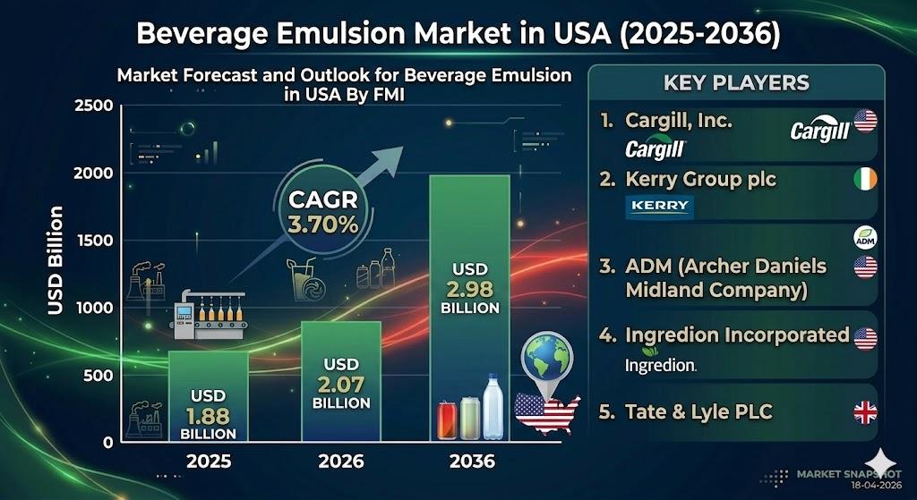 NEWARK, Del., USA | April 23, 2026 According to Future Market Insights (FMI), the demand for beverage emulsion in the USA is projected to grow from USD 2.07 billion in 2026 to USD 2.98 billion by 2036, registering a CAGR of 3.7%. Growth is being driven by regulatory-led reformulation, rising demand for functional beverages, and increasing adoption of clean-label stabilizer systems.