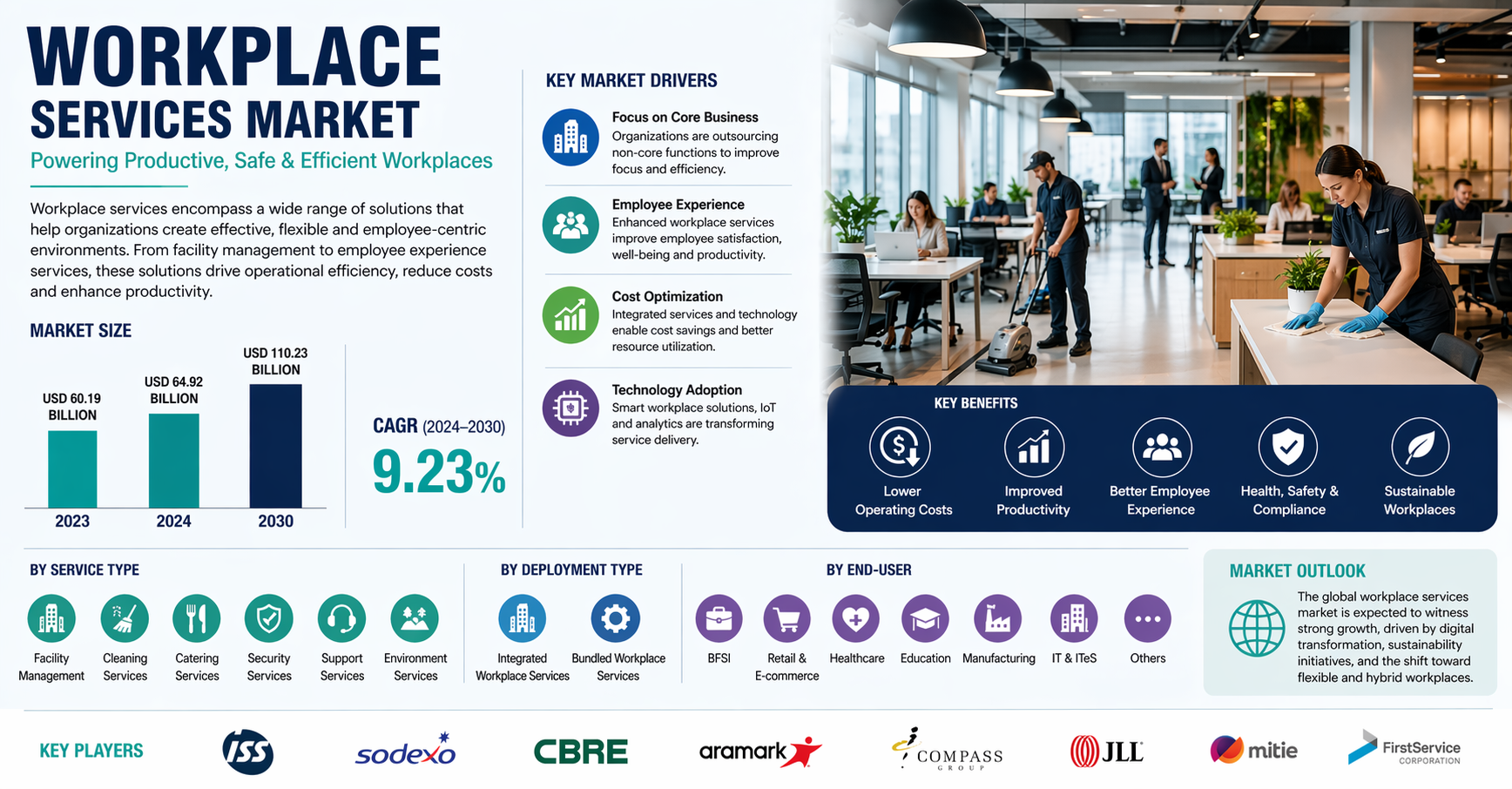 The Workplace Services Market Trends is experiencing significant growth as organizations increasingly invest in digital workplace transformation, enterprise mobility, and advanced IT support solutions. Workplace services include end-user outsourcing, technical support, workplace automation, collaboration tools, and managed IT services that help enterprises improve operational efficiency and employee productivity. The rising need for flexible work environments, cloud-based infrastructure, and secure enterprise systems is accelerating the adoption of workplace services solutions globally.