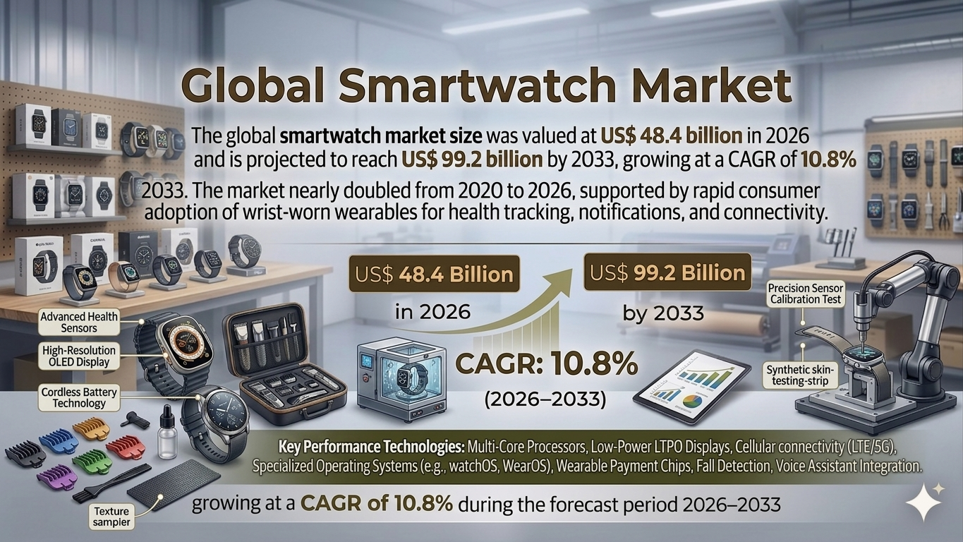 The global smartwatch market has emerged as one of the fastest-growing segments within the consumer electronics and wearable technology industry. According to recent estimates, the market was valued at US$ 48.4 billion in 2026 and is projected to reach US$ 99.2 billion by 2033, expanding at a CAGR of 10.8% between 2026 and 2033. This remarkable growth trajectory reflects the increasing integration of advanced technologies such as health monitoring sensors, artificial intelligence, and IoT connectivity into compact wearable devices. The market nearly doubled from 2020 to 2026, driven by a surge in consumer awareness around health, fitness, and digital convenience. Smartwatches have evolved from simple notification devices into multifunctional tools capable of tracking heart rate, sleep patterns, physical activity, and even blood oxygen levels, making them essential lifestyle companions.
