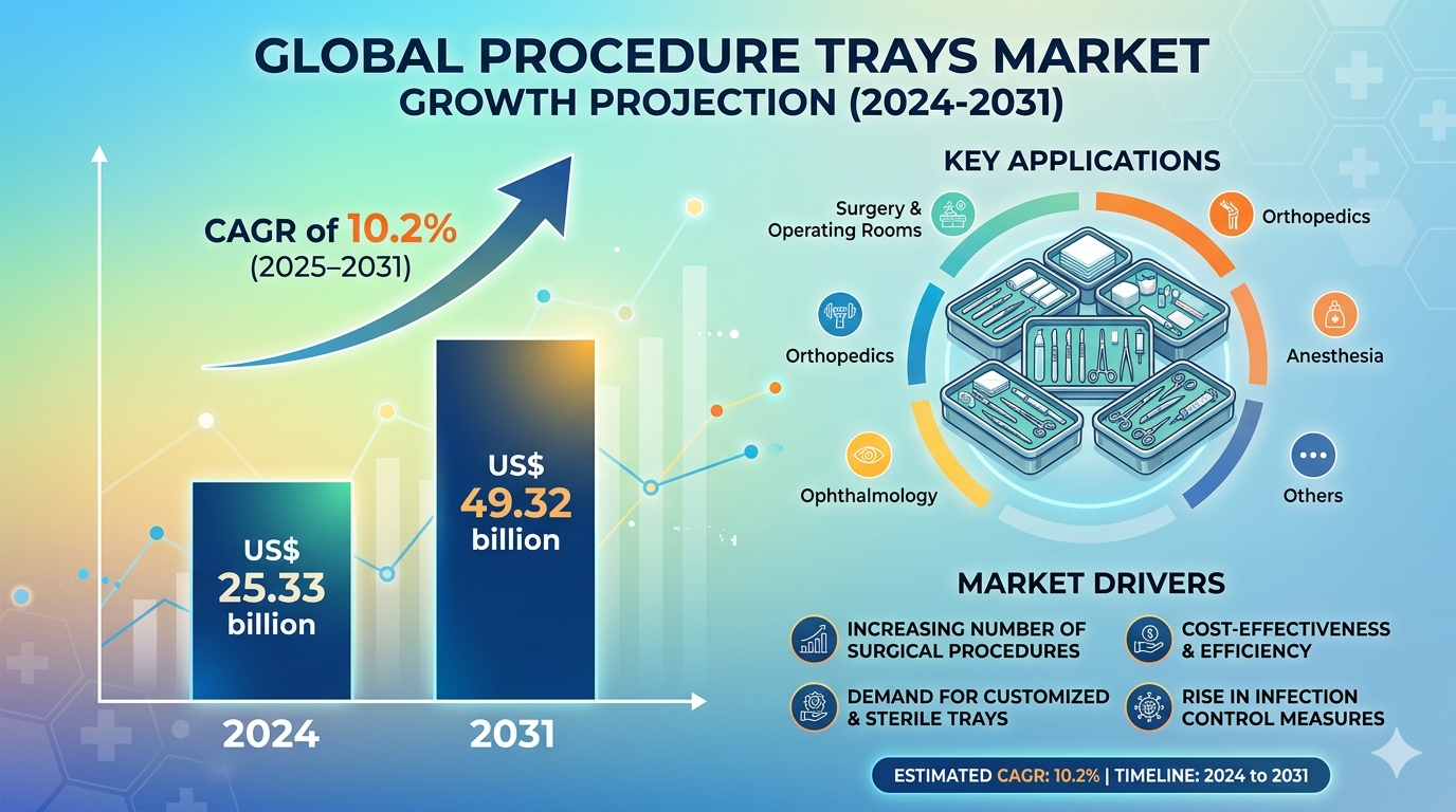 The procedure trays market was valued at US$ 25.33 billion in 2024 and is expected to reach US$ 49.32 billion by 2031. It is estimated to register a CAGR of 10.2% during 2025–2031.