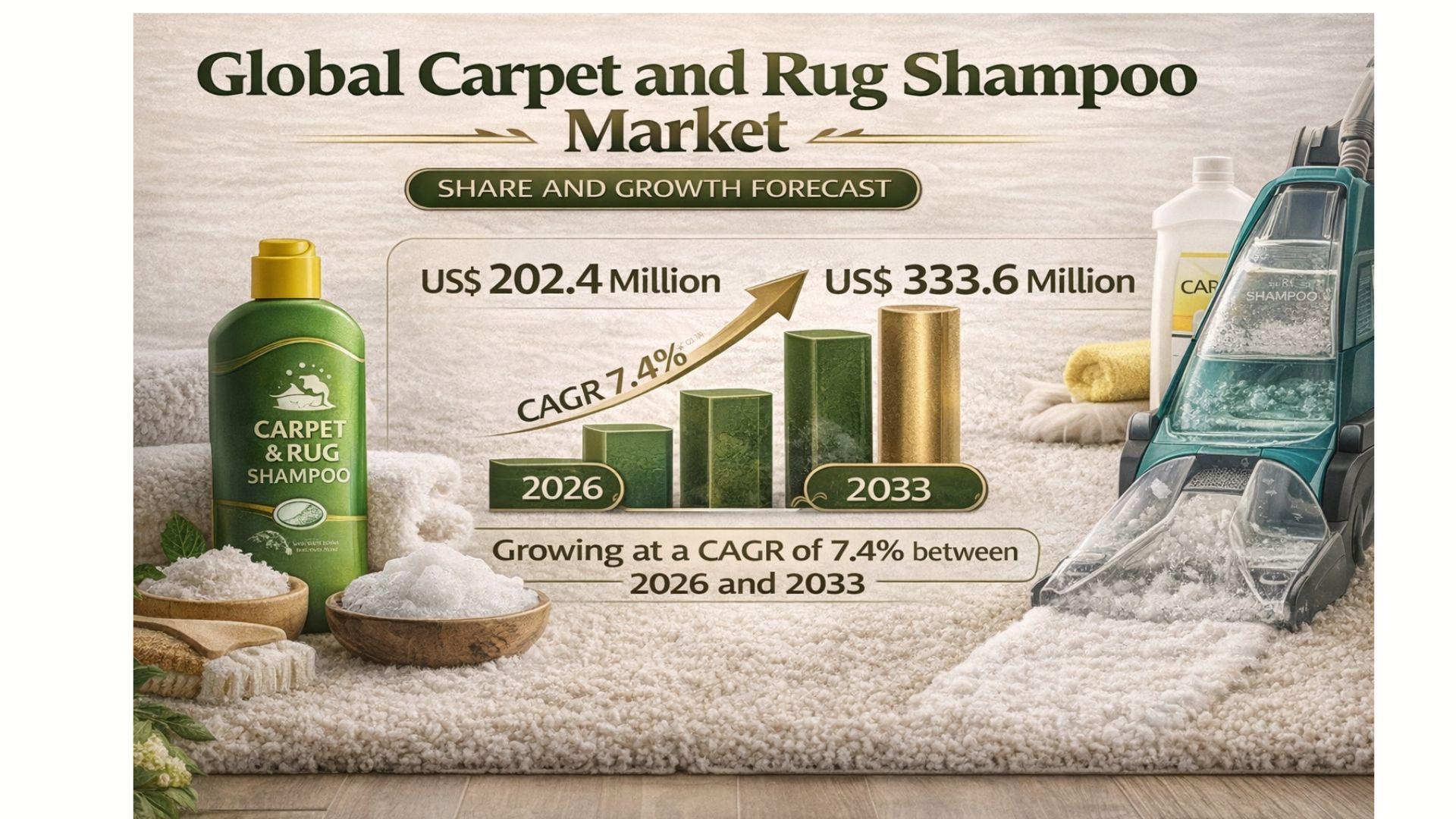 The global carpet and rug shampoo market is steadily gaining momentum, driven by increasing consumer awareness regarding hygiene, cleanliness, and indoor air quality. The global carpet and rug shampoo market size is expected to be valued at US$ 202.4 million in 2026 and is projected to reach US$ 333.6 million by 2033, expanding at a CAGR of 7.4% between 2026 and 2033. This growth trajectory reflects the rising demand for effective cleaning solutions across residential and commercial sectors, especially as carpets and rugs continue to be widely used in homes, offices, hotels, and public spaces. Increasing urbanization, improved living standards, and a growing inclination toward premium home care products are contributing significantly to the expansion of the carpet cleaning solutions market.