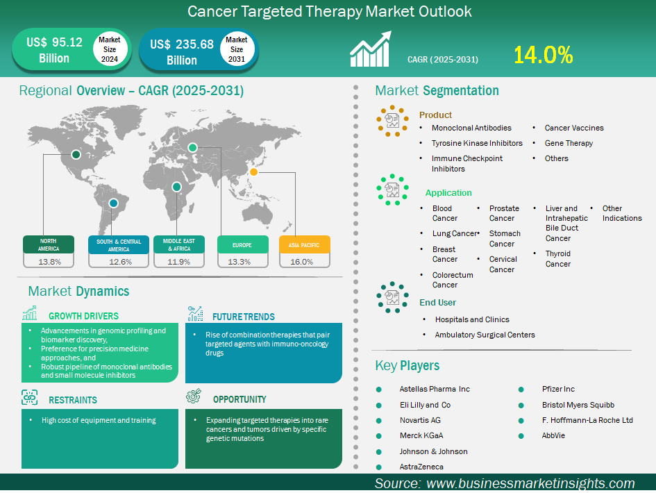 The Cancer Targeted Therapy Market segmentation framework, as detailed in this Cancer Targeted Therapy Market Report, provides a comprehensive and clinically structured view of the industry across three key dimensions: therapy type, indication, and end-user. This segmentation enables stakeholders to identify the most commercially significant targeted therapy categories, understand the clinical evidence and regulatory approval drivers behind segment leadership, and align product development and market entry strategies with the highest-value growth opportunities across the global precision oncology market. The market is valued at US$ 95.12 billion in 2024 and is forecast to reach US$ 235.68 billion by 2031 at a CAGR of 13.84%.