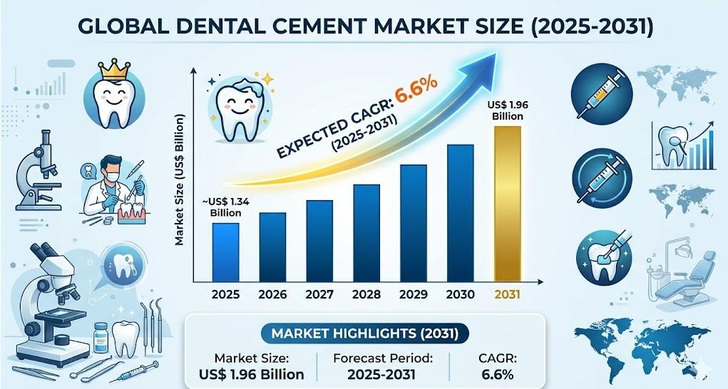 The Dental Cement Market Size is expected to reach US$ 1.96 Billion by 2031, rising from US$ 1.25 Billion in 2024, and is projected to register a CAGR of 6.6% during 2025 to 2031. This growth is supported by increasing dental procedure volumes, technological advancements in dental materials, and expanding access to dental care services across emerging economies.
