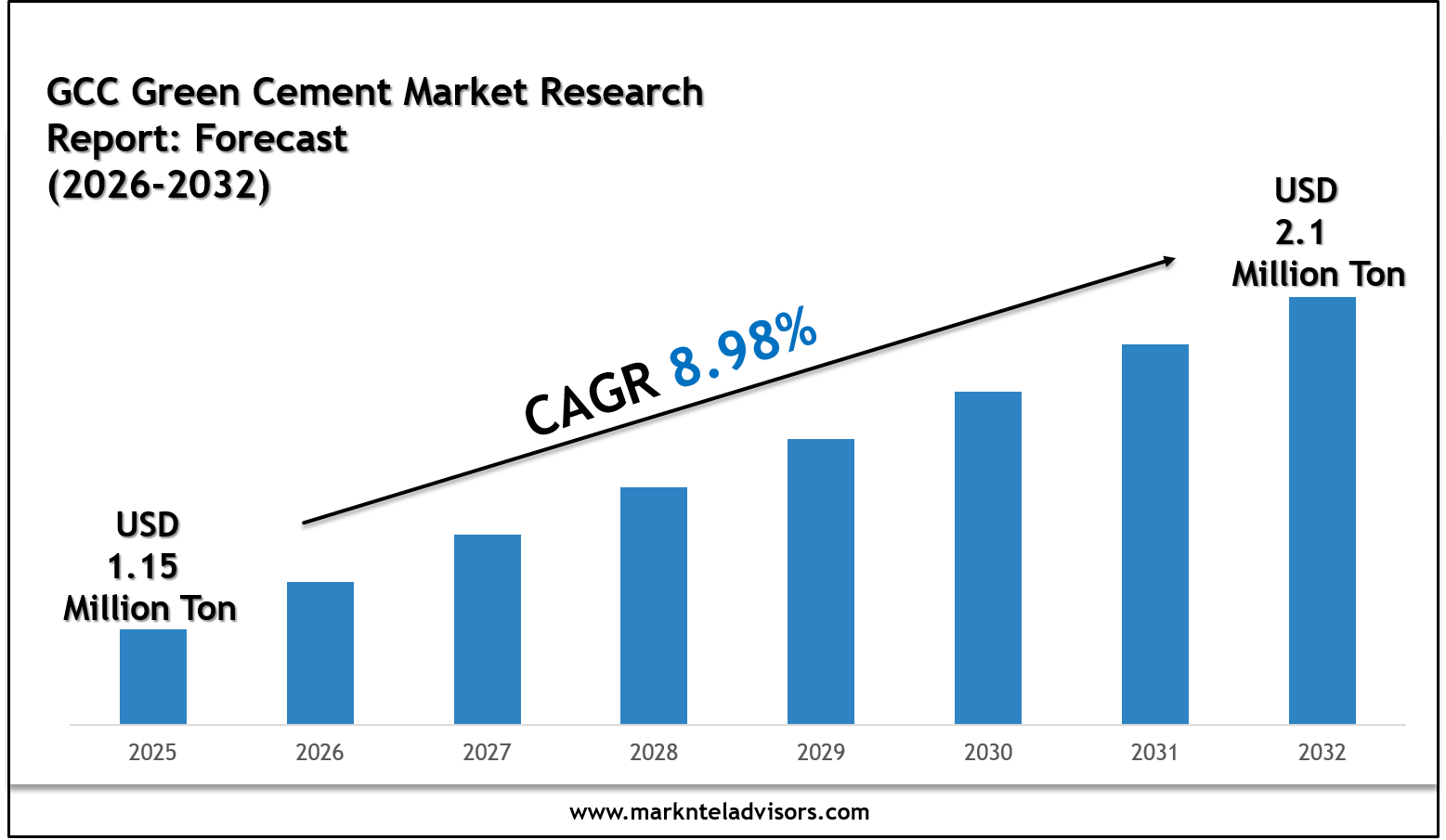 As per MarkNtel Advisors The GCC Green Cement Market size is valued at around 1.15 million tons in 2025 and is projected to reach 2.1 million tons by 2032. Along with this, the market is estimated to grow at a CAGR of around 8.98% during the forecast period, i.e., 2026-32.