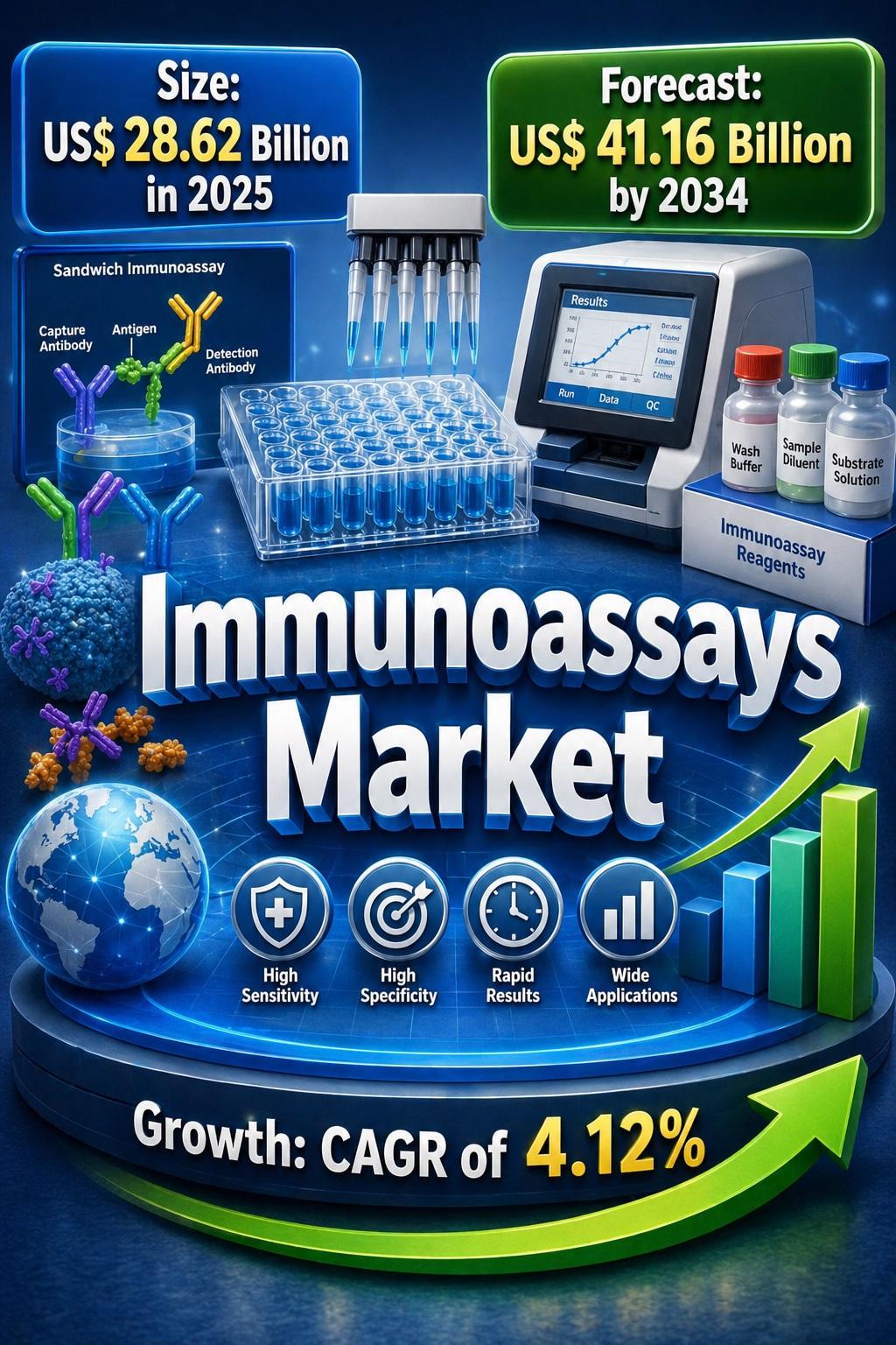 The immunoassays market is expected to grow steadily as healthcare systems prioritize early detection, rapid diagnostics, and personalized treatment approaches. Emerging technologies such as AI integration, wearable diagnostics, and lab-on-a-chip platforms will continue to shape the industry through 2034.
