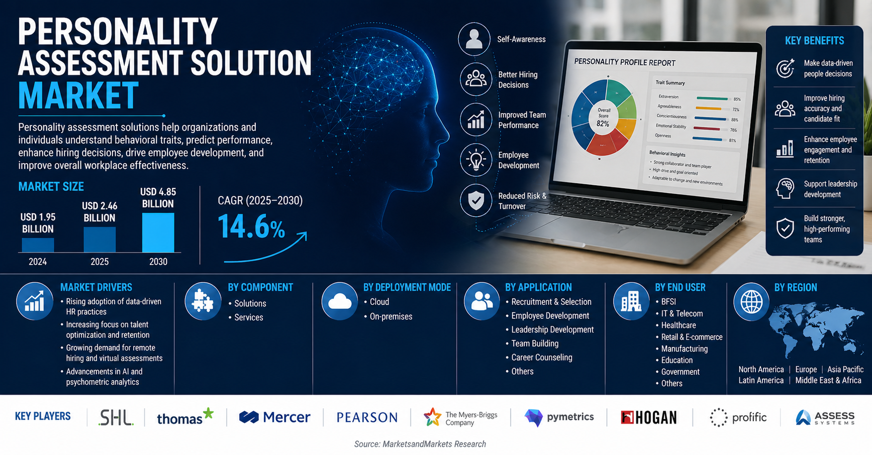 The Personality Assessment Solution Market Analysis is experiencing rapid expansion as organizations increasingly adopt digital tools to evaluate behavioral traits, cognitive abilities, and emotional intelligence. These solutions are widely used across corporate enterprises, academic institutions, and government organizations to enhance recruitment processes, employee development, and leadership training. Personality assessment platforms leverage psychometric testing, artificial intelligence (AI), and behavioral analytics to provide deeper insights into individual characteristics, enabling organizations to make informed talent management decisions.