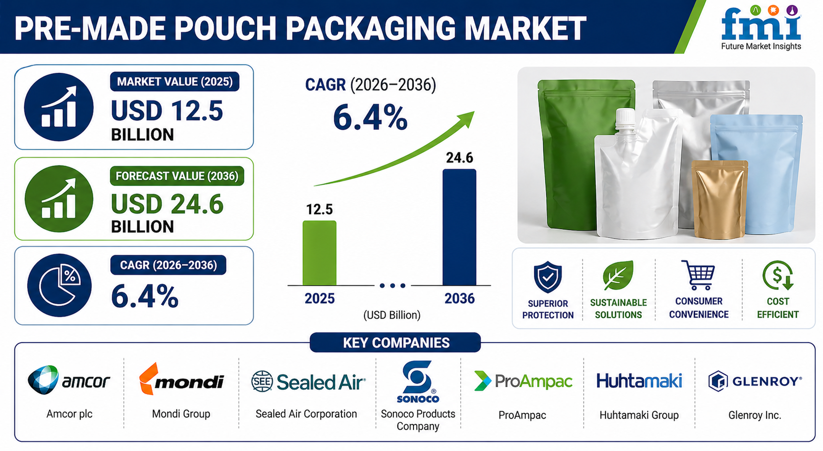 The global pre-made pouch packaging market is gaining strong traction as brands shift toward flexible, lightweight, and visually appealing packaging formats. Valued at USD 13,253 million in 2026, the market is projected to reach USD 24,646 million by 2036, expanding at a CAGR of 6.4% during the forecast period. Growth is being fueled by the increasing need for packaging that combines product protection, convenience, and retail differentiation, particularly across food, beverages, personal care, and household product segments.