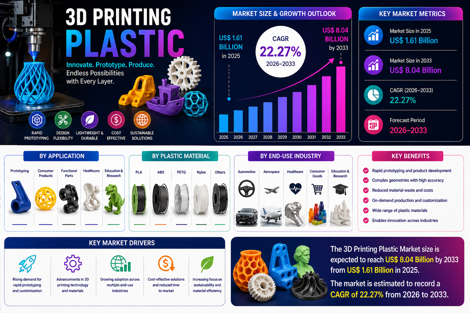 The financial trajectory of this sector reflects its growing industrial importance. The 3D Printing Plastic Market size is expected to reach US$ 8.04 Billion by 2033 from US$ 1.61 Billion in 2025. The market is estimated to record a CAGR of 22.27% from 2026 to 2033.This rapid expansion is underpinned by a surge in demand for decentralized manufacturing and the continuous digitalization of the factory floor.