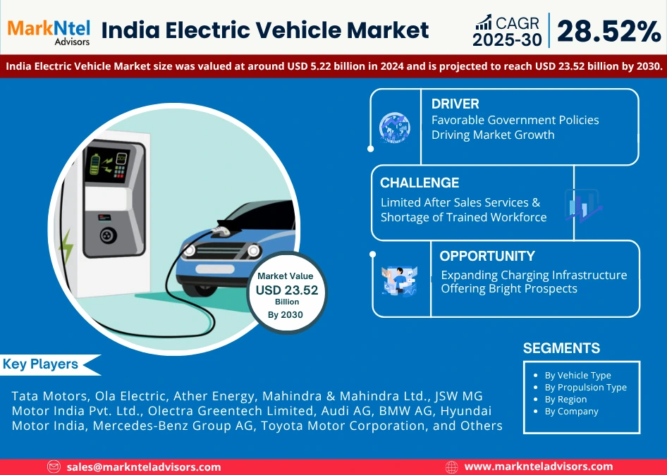 MarkNtel Advisors, a leading market research and consulting firm, has announced the release of its latest study titled India Electric Vehicle Market Research Report: Forecast (2025–2030). This report provides a detailed assessment of the India Electric Vehicle Market, covering its evolving dynamics, emerging trends, key growth drivers, major challenges, and competitive landscape.