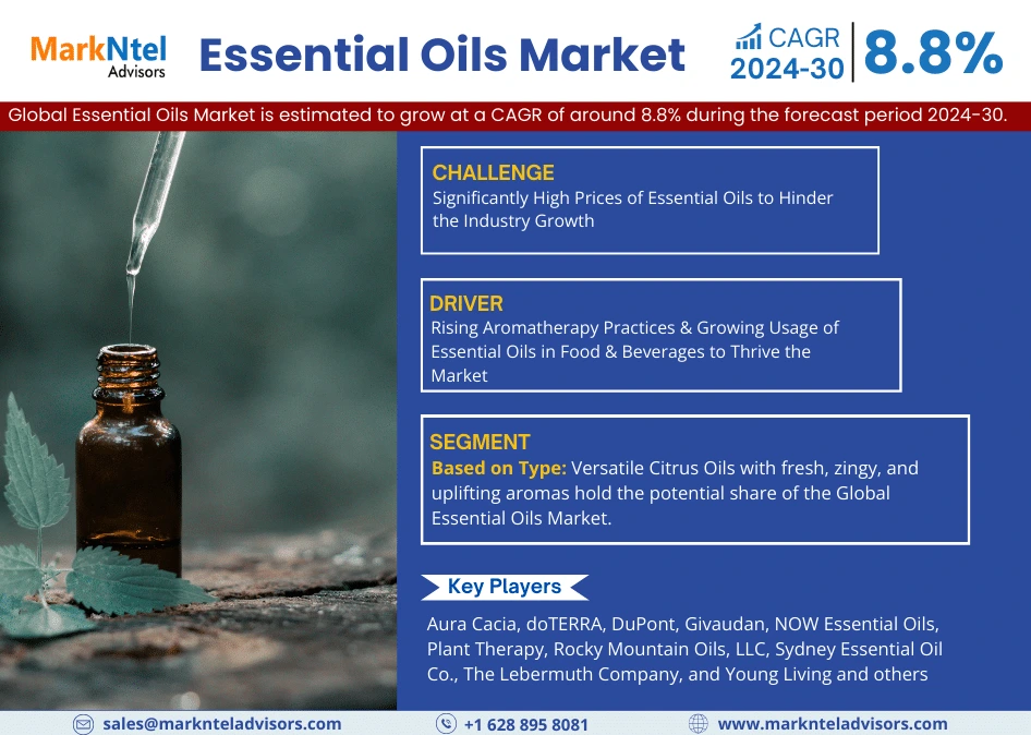 MarkNtel Advisors, a leading market research and consulting firm, has announced the release of its latest study titled Essential Oils Market Research Report: Forecast (2024–2030). This report provides a detailed assessment of the Essential Oils Market, covering its evolving dynamics, emerging trends, key growth drivers, major challenges, and competitive landscape.